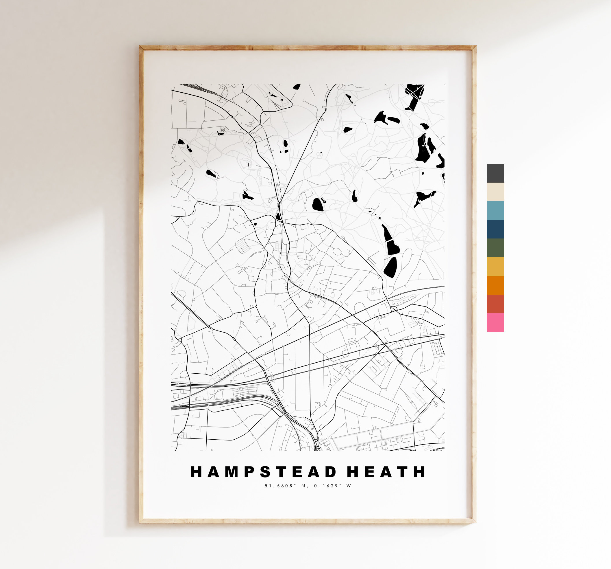 Hampstead Heath map in a minimalist black/white style or choose from a range of colours. These maps look great as a feature piece or as part of a set over a statement piece of furniture. You can personalise this print by adding up to two lines of custom text beneath the city title, or by adding a heart over a location or address.