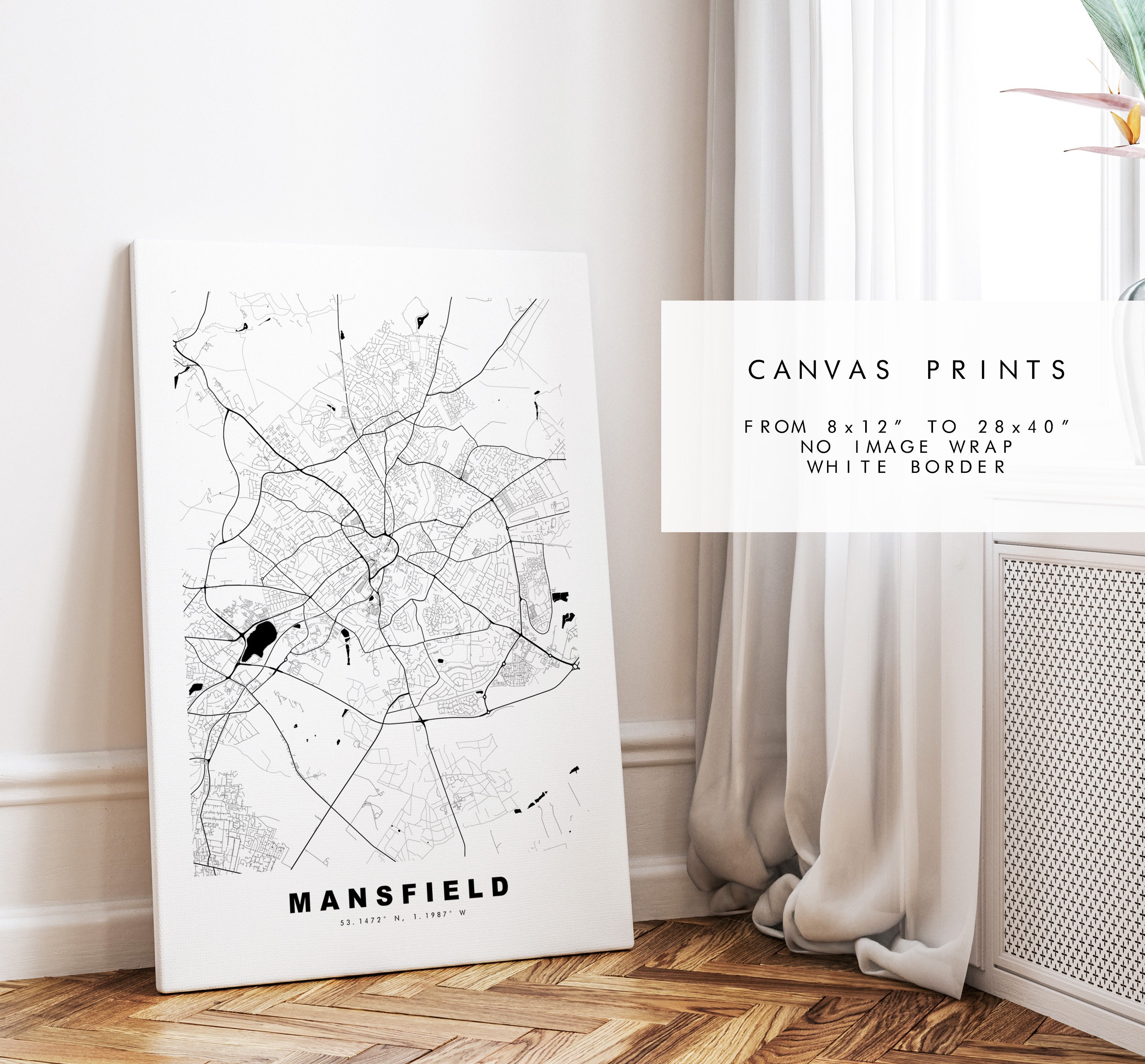 Mansfield map in a minimalist black/white style or choose from a range of colours. These maps look great as a feature piece or as part of a set over a statement piece of furniture. You can personalise this print by adding up to two lines of custom text beneath the city title, or by adding a heart over a location or address.