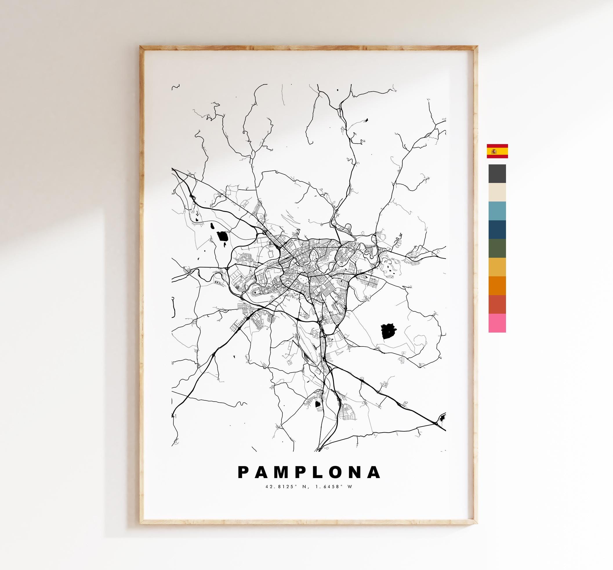 Pamplona map in a minimalist black/white style or choose from a range of colours. These maps look great as a feature piece or as part of a set over a statement piece of furniture.